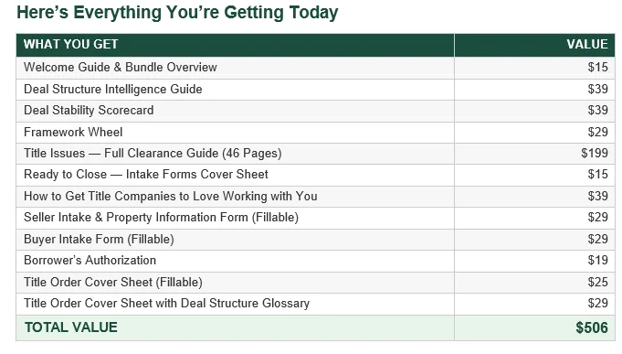 ✅ FREE BONUS: How to Get Title Companies to Love Working with You — The insider guide from someone who spent 20+ years on the title side. Learn what makes closers prioritize your file, what phrases trigger red flags, and how to build a reputation as a professional investor.